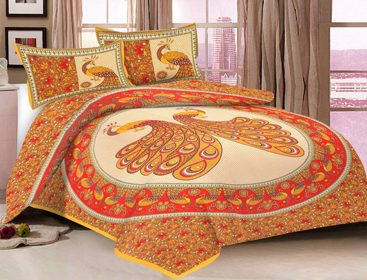 Rajasthani Jaipuri Traditional Sanganeri 2 Kaam Peacock Print 100% Cotton Double Size Bedsheet with Two Pillow Covers