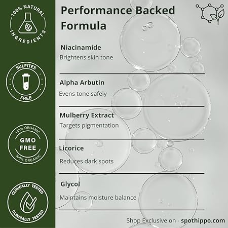 - Skin Type All Product Benefits Brightens Dull Skin – Boosts radiance and glow for a healthier look., Evens Skin Tone – Restores natural, uniform skin color in delicate areas., Fragrance-Free Formula – No artificial scents, perfect for sensitive skin., Gentle on Sensitive Areas – Safe for bikini line, underarms, neck, and inner thighs., Prevents Further Darkening – Protects against tanning and uneven pigmentation with regular use., daily serum to reduce hyperpigmentation, acne marks, dark spots, blemishes & age spots Use for Chest, Face, Whole Body Scent Fragrance Free Special Ingredients Alpha Arbutin, Alpha Arbutin (2%) – A gold-standard skin brightening agent that reduces melanin for visible tone correction, Lactic Acid – Gently exfoliates dead skin and smoothens texture, Mulberry Extract – Natural tyrosinase inhibitor that helps fade hyperpigmentation and brighten skin naturally, Niacinamide – Improves skin barrier, reduces dullness, and soothes inflammation Kojic Acid & Mulberry Root – Dual-action pigmentation control agents that improve radiance Brand Spot hippo Item Form Drop Material Feature Fragrance Free, Hypoallergenic, Natural Active Ingredients Hyaluronic Acid, Kojic Acid Item Weight 1 Ounces